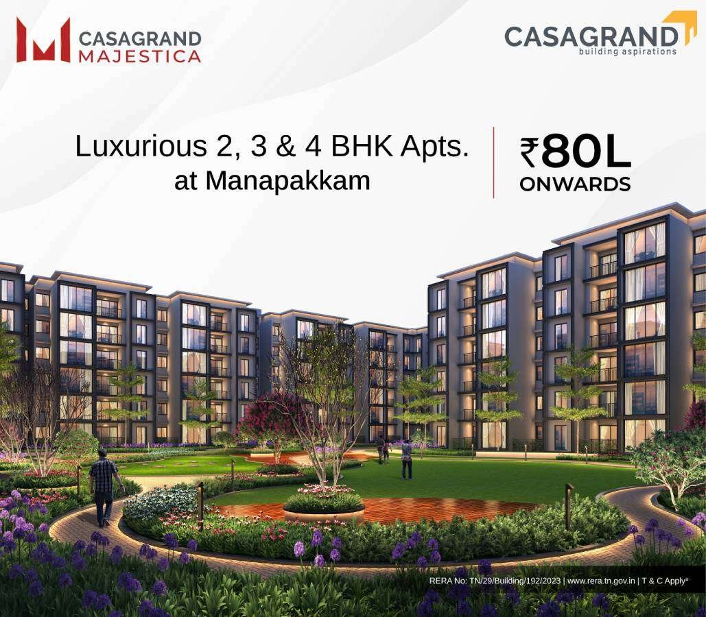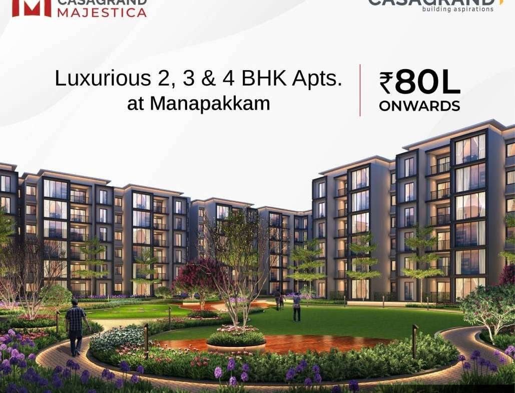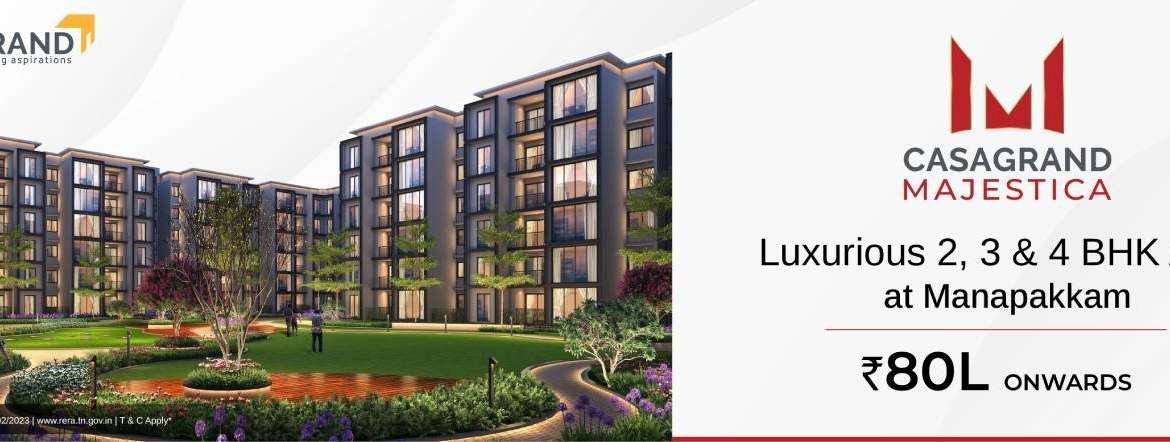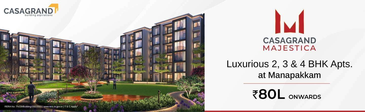 Casagrand Majestica gifts you the most unparalleled Ultra Luxury at Manapakkam just 5 mins from Guindy. Premium community design with 646 finely crafted apartments set amidst 11.8 acres of area planned with vast green spaces. 65% of the open space adds to the efficiency of the building footprint. Light, ventilation, Vaastu, privacy & aesthetics are the 5 important pillars in planning the master & unit plans. The community has 3 grand open podiums along with lush green belt giving you the opportunity to be with nature.