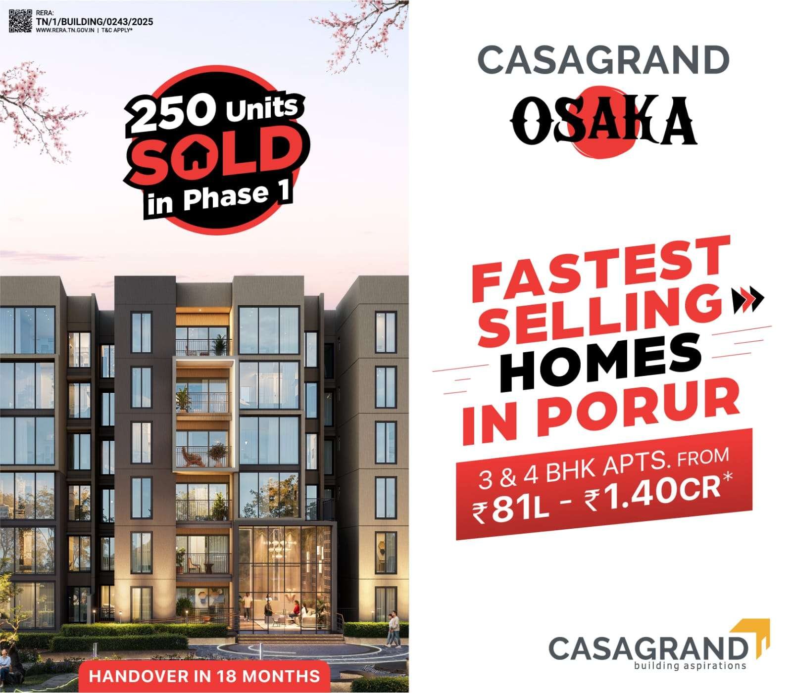 Casagrand Builder Private Limited is a real estate enterprise committed to building aspirations and delivering value. In the last fifteen years, we have developed over 22 million sqft of prime residential real estate across Chennai, Bengaluru, and Coimbatore. Over 18,250 happy families across 112+ landmark properties stand testimony to our commitment. In the sixteenth year of our journey, we at Casagrand are all set to progress further forward with projects worth over Rs. 8000 crores in the pipeline.