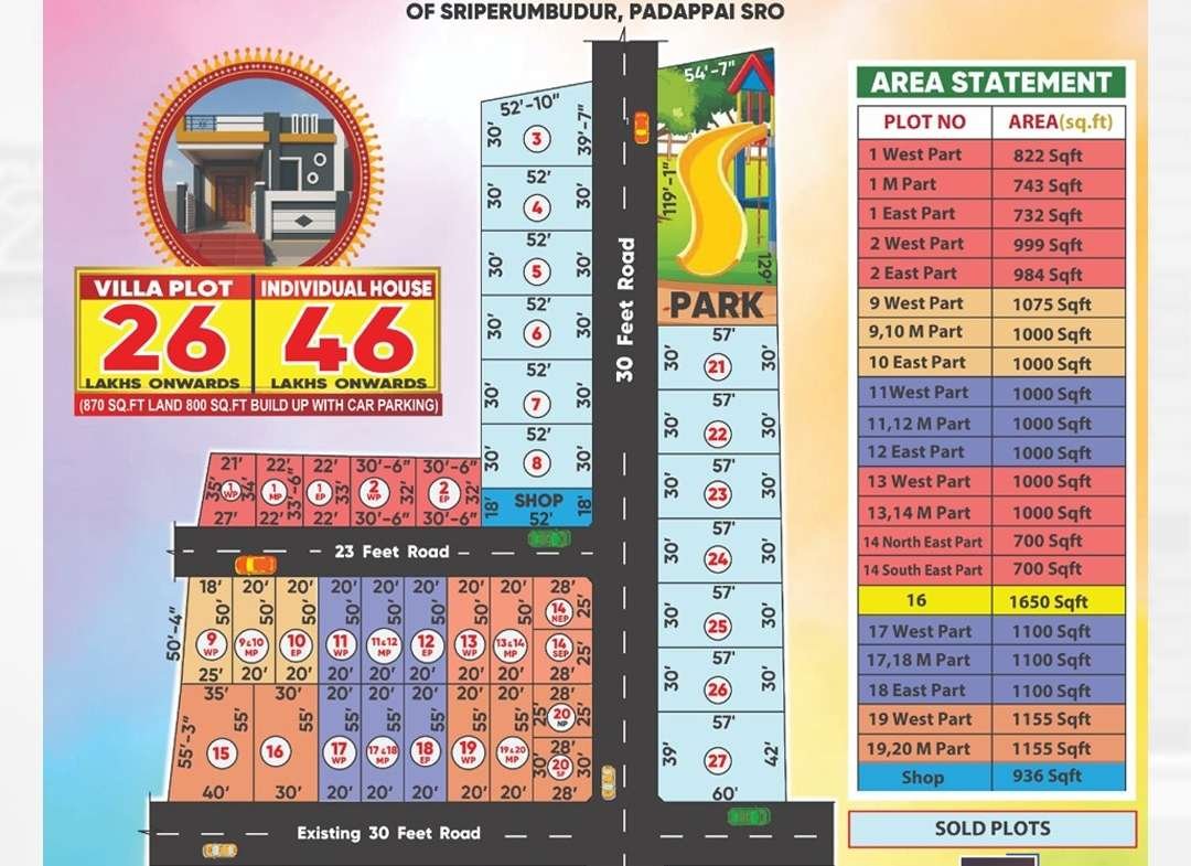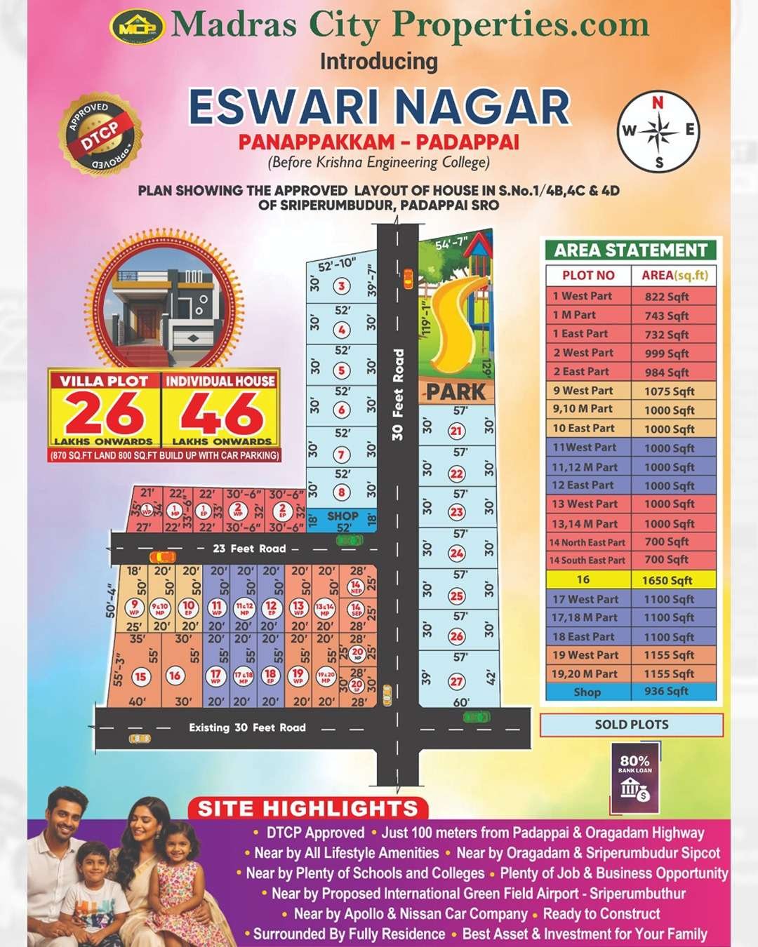 Madras Eshwari Nagar in Padappai, developed by Madras City Properties , is a DTCP-approved residential layout 100 meters from the Padappai-Oragadam Highway. It offers ready-to-construct plots starting from ₹26 Lakhs and individual villas, featuring proximity to Oragadam SIPCOT, schools, and proposed greenfield airport.